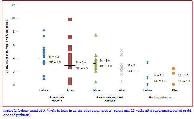 Chronic exposure to high concentration of arsenic caused an increase in the colony count of Bacteroides fragilis in the feces in comparison to healthy volunteer (3.6 × 10¹¹ ± 1.9 vs 1.5 × 10¹¹ ± 1.7 CFU/g of feces) which was not statistically significant. But significant increase in the colony count of B. fragilis was seen in the feces of palmar arsenical keratosis patient (4.2 × 10¹¹ ± 1.9 CFU/g of feces; p=0.0390). Supplementation with probiotic for 12 weeks decreased the colony counts in all three groups which were not statistically significant among the groups. Probiotics decreased the amount of arsenic in the nail of all the three groups significantly.