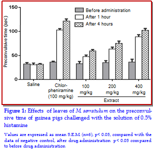The plant Myxopyrum serratulum is traditionally claimed to relieve asthma and cough. The present study was undertaken to evaluate the bronchodilatory effect of the methanolic extract of M. serratulum on histamine-induced bronchospasm by in vivo and the inhibitory effect of the extract on histamine-contracted tracheal chain and ileum by in vitro guinea pig model. Additionally, the relaxant effect of four cumulative concentrations of the extract (0.25, 0.5, 0.7 and 1.0 g%) was assessed using precontracted tracheal chain under different conditions. The extract (400 mg/kg) prolonged the preconvulsive time to 102.3 ± 3.8 sec when compared to saline and standard chlorpheniramine maleate as 121.3 ± 4.5 sec (p<0.05). The extract also possessed significant inhibitory effect on histamine-contracted guinea pig ileum and tracheal chain and also exhibited significant relaxation effect on precontracted tracheal chain of guinea pig models contracted by 60 mM KCl (p<0.001) and 10 µM methacholine (p<0.001) when compared with standard theophylline.