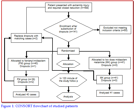 The aim of the present study was to investigate two pharmaceutical groups including fentanyl-midazolam and midazolam-ketamine used as patient seda-tion analgesia for the orthopedic emergency procedures. This is a prospective randomized double-blind and placebo-controlled trial study. Trauma patients admitted to emergency department who needed emergency reduction were enrolled. Finally 81 patients with mean age of 31.7 ± 20.6 years old were participated (64.2% male). It is likely that the combination of midazolam-ketamine had a better performance in terms of the duration of hypoxia (p=0.01), and pain scores during reduction (p=0.001). However, adverse effects were higher in the midazolam-ketamine group compared to the fentanyl-midazolam. The level of satisfaction of physicians and patients were the same.