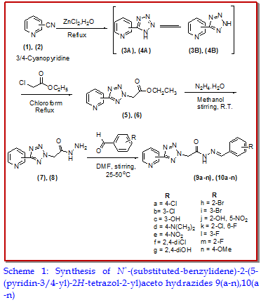 Two new pharmacologically active series of tetrazolopyridine-acetohydrazide conjugates [9 (a-n), 10 (a-n)] were synthesized by reacting a variety of suitably substituted benzaldehydes and isomeric 2-(5-(pyridin-3/4-yl)-2H-tetrazol-2-yl)acetohydrazides (7, 8). The synthesized compounds were analyzed through FTIR, 1H NMR, 13C NMR and elemental techniques. These acetohydrazides were screened for their in vivo antidiabetic activity and molecular docking studies. An excellent agreement was obtained as the best docked poses show-ed important binding features mostly based on interactions due to an oxygen atom and aromatic moieties of the series. The compounds 9a, 9c and 10l were found to be the most active in lowering blood glucose, having the potential of being good antidiabetic agents.