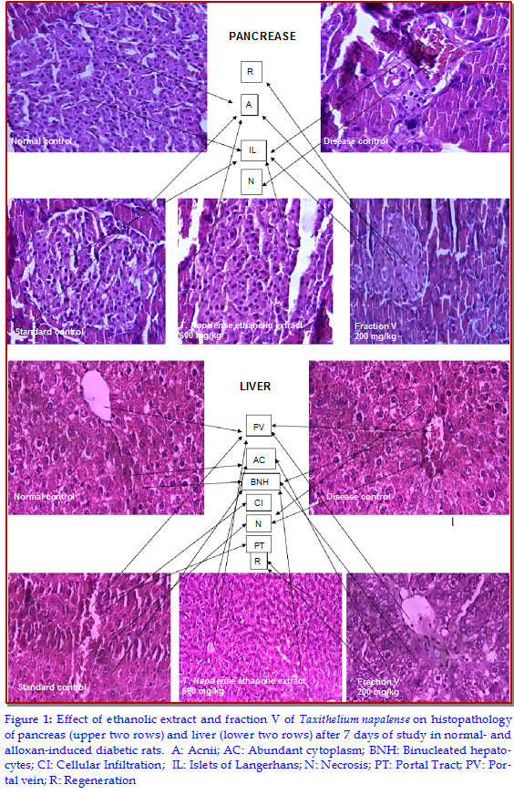 In this work, Taxithelium nepalense ethanolic extract and its fractions were evaluated for the antidiabetic activity in rat based on phytochemical and free radical scavenging properties. The ethanolic extract, fraction IV and V significantly attenuated the blood glucose levels at 600, 200 and 200 mg/kg with 50.0, 33.5 and 42.0% inhibition respectively. The histopathological studies were manifesting the recuperation of damaged cells in liver and pancreas tissues. The outcomes of the present work affirm that the T. nepalense has a potency to plummet the overproduction of free radicals and blood glucose levels in the diabetic-induced rat.