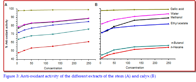 The different parts of Physalis philadelphica were evaluated for the antifungal, anti-oxidant and HPLC assay. The methanol extract of leaf showed inhibitory activity against Pencillium digitatum (58% ZI), Aspergillus flavus (95% ZI) and Rhizopus oryzae (96% ZI) at a concentration of 400 ppm. Strong anti-oxidant activities were found in different parts of the plant. The effects of different extraction solvents on the anti-oxidant activity and antifungal activity of the medicinal extracts were observed. The methanol extract from the leaf, stem, fruit and water fractions from the calyx exhibited strong anti-oxidant activity of 94, 89, 88 and 93% respectively. The ethyl acetate extract was found as a best solvent for the recovery of gallic acid in HPLC assay. No correlation was observed between the gallic acid and anti-oxidant capacity of the extracts.