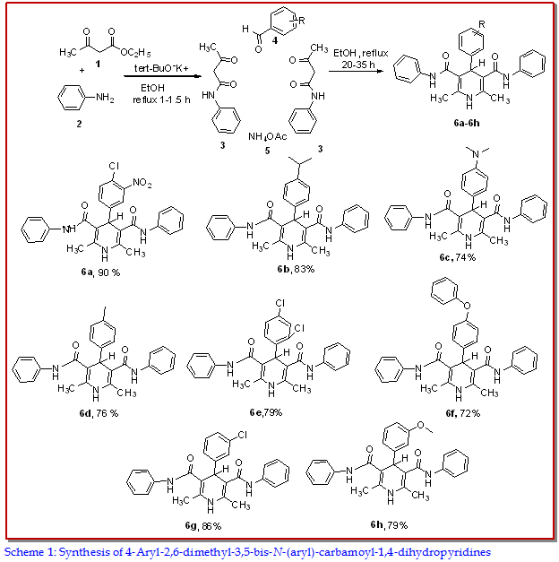 A series of 4-aryl-2,6-dimethyl-3,5-bis-N-(aryl)-carbamoyl-1,4-dihydropyri-dines 6a-6h were prepared by using the one-pot three component synthetic method. The target compounds 6a-6h were synthesized by reacting two molar equivalents of ketone functionality and one mole of aromatic aldehydes in ammonium acetate to obtain the desired products. The structures of newly synthesized compounds were characterized by FT-IR, 1H-NMR, 13C-NMR, and elemental analysis. All the synthesized compounds were screened for their elastase inhibition and antioxidant activity. Almost all of the com-pounds 6a-h showed good to excellent activities against elastase enzyme more than the reference drug. Compounds 6d and 6b at 0.2 ± 0.0 µM and 0.2 ± 0.0 µM were found to most potent derivatives against elastase enzyme. Compound 6a exhibited prominent free radical scavenging activity. From the results of the biological activity, we infer that some derivatives can serve as lead molecules in pharmacology.