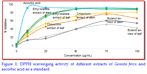 The prevention and treatment of the cancer using plants have attracted increasing interest. The present study was aimed to determine the phenolic compounds of Genista ferox using HPLC-TOF/MS and the anti-oxidant acti-vity associated with anti-cancer activity against human cervical adenocarcinoma (HeLa) cell line. Total anti-oxidant capacities of different extracts of G. ferox were assessed by DPPH assay, and their total phenolic and flavonoids contents measured by FolinCiocalteu and aluminum trichloride assays. The amounts of total phenolic (105.2 ± 0.6 308.5 ± 5.7 mg/g) of extract measured as gallic acid equivalent and flavonoids (8.1 ± 0.1 124.0 ± 0.7 mg/g) of extract measured as quercetin equivalent varied from chloroform to n-butanol extract of the two parts of the plant (leaf and stem). The ethyl acetate extract of G. ferox exhibited the most powerful effect on the DPPH scavenging activity with 94% from the leaf and 93% from the stem, while the chloroform extract from the leaf exhibited the most effective anti-proliferative activity against HeLa cell lines.