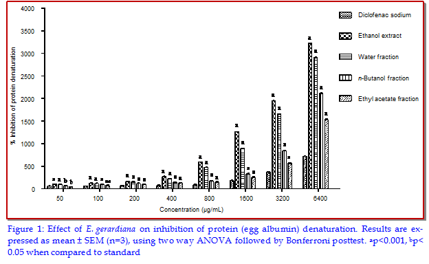 The present study determines the anti-arthritic potential of Ephedra gerardiana ethanolic extract and its ethyl acetate, n-butanol and aqueous fractions adopting in vitro and in vivo tests. In vitro tests included thermally induced bovine serum albumin denaturation and egg albumin denaturation, also membrane stabilizing assay at concentration of 50-6400 µg/mL, whereas in vivo study comprised formaldehyde-induced arthritis at 50, 100 and 200 mg/kg doses. The crude extract and fractions inhibited protein denaturation and stabilized red blood cells membrane in concentration-dependent fashion, with maximal effect achieved at 6,400 µg/mL (p<0.001). Similarly, in formaldehyde model, the extract and fractions dose-dependently reduced injected paw volume and diameter, with maximum reduction at 200 mg/kg (p<0.001). However, results of aqueous fraction were on a par with hydroalcoholic extract in each test. These results suggest that E. gerardiana provides protection against arthritis that might be owing to the existence of phytoconstituents thus, supporting folkloric claim.