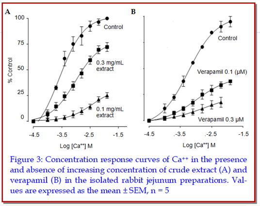 The current study was conducted to screen the possible pharmacological activity of Cnicus arvensis on the gastrointestinal system. The methanolic extract exerted concentration-dependent (0.01–3.0 mg/mL) spasmolytic effect using isolated tissue preparations of rabbit jejunum and caused relaxation of K+(80 mM)-induced spastic contractions. There was non-parallel shift in Ca++ concentration response curves towards right at tissue bath concentrations of 0.3 and 1.0 mg/mL. The solvent-solvents fractionation revealed domination of spasmolytic effects in petroleum ether fraction as compared to aqueous fraction. The methanolic extract also found to reduce the retching in chicks at 150 mg/kg as compared to chlorpromazine. The methanolic crude extract also found to reduce the number of wet spots using castor oil-induced diarrhea in rat as compare to loperamide. Our results reflected the presence of Ca++ channel blocking activity in methanolic extract, thus rationalizing the medicinal use of C. arvensis in diarrhea and vomiting.