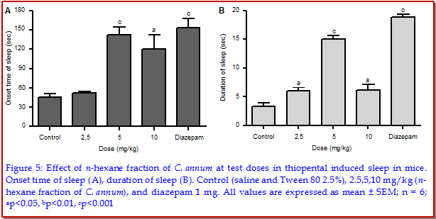 The current study deals with anxiolytic, muscle relaxant and sedative like activities of Capsicum annuum in animal models. The crude extract was found safe in acute behavior and toxicity studies. However, the n-hexane fraction caused severe acute toxicity. Pretreatment of crude extract and n-hexane fraction elicited marked dose-dependent antianxiety-like effects in elevated plus-maze and dark and light models. The results showed significant (p< 0.05) antianxiety-like effects of crude extract while highly significant (p< 0.001) for n-hexane fraction. Similarly, an effect on muscle coordination was tested in traction model, where both crude extract and n-hexane fraction evoked marked dose-dependent activity. The effect of thiopental-induced sleep test of crude extract and n-hexane fraction was highly significant (p< 0.001). All together, the results revealed potent anxiolytic, muscle relaxant and sedative like activities of C. annuum in animal models and the pharmaco-logically active constituents are mostly non-polar in nature.