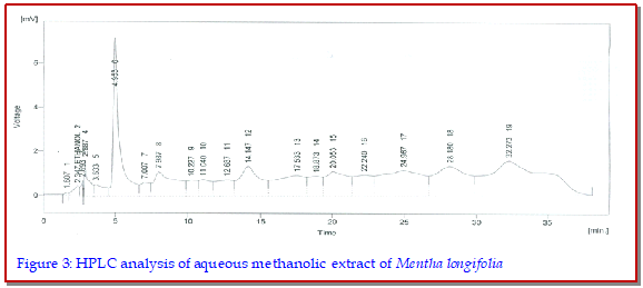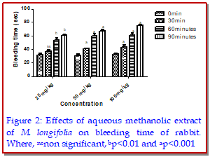 The present research work was conducted to appraise the antithrombotic activity of Mentha longifolia using in vitro and in vivo experiments. Aqueous methanolic (70:30) extract produced significant (p<0.01-0.001) and dose-dependent increase in in vitro blood clotting time, bleeding time, prothrombin time and activated partial thromboplastin level with maximum effect at highest concentration. While in in vivo experiment, aqueous methanol extract showed noteworthy (p<0.01-0.001) prolongation in bleeding time and clotting time after 30, 60 and 90 min of administration except for 25 mg/kg at 30 min which is non-significant. Moreover, plant extract exhibited considerable increase (p<0.1-0.001) in bleeding time, clotting time, prothrombin time as well as activated partial thromboplastin time in rabbits after seven days of treatment. Additionally, HPLC analysis of M. longifolia aqueous methanolic extract illustrated the presence of various valuable phytoconstituents. In a nutshell, M. longifolia possesses potential antithrombotic activity and hence systematically proved to be beneficial in patients with vascular diseases.