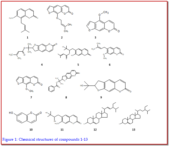 Eleven coumarins named osthole (1), imperatorin (2), bergapten (3), prantschimgin (4), grandivitinol (5), suberosin (6), xanthotoxin (7), felamidin (8), marmesin (9), umbelliferone (10), ulopterol (11), and a sterol mixture consisted of stigmasterol (12), β-sitosterol (13) were isolated from the roots of Ferulago blancheana, F. pachyloba and F. trachycarpa through in vitro bioassay-guided fractionation processes. The extracts and bioactive compounds were evaluated for their α-amylase and α-glucosidase activities. Among the tested compounds, felamidin and suberosin showed significant α-glucosidase inhibitory activity with IC50 values of 0.4 and 0.9 mg/mL, respectively, when compared to the reference standard acarbose (IC50 = 4.9 mg/mL). Grandivitinol (IC50 = 20.0 mg/mL) had the lowest inhibitory effect. On the other hand, none of the tested extracts were found to be active on α-amylase inhibition. This is the first report on isolation, characterization of the bioactive compounds and evaluation the α-amylase and α-glucosidase inhibitory activities of these species.