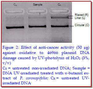 This study was designed to evaluate in vitro the total phenolic, flavonoid content, antioxidant activity, oxidative DNA-damage protection and anti-cancer activity of n-butanol extract from Perralderia coronopifolia, endemic plant. DNA protection capacity was performed using 46966 plasmid DNA against UV-photolysis of H2O2-induced oxidative damage. The antiproliferative effects of extract were performed on HeLa and C6 cells. Experimental results showed that extract had convenient number of phenolic and flavonoids. Furthermore, it provided strong anti-oxidant, reducing power, hydrogen peroxide and higher DPPH· scavenging ability with IC50= 7.02 ± 0.02 µg/mL. As it shown an oxidative plasmid DNA-damage inhibition against UV-photolysis of H2O2, an anti-cancer activity athigher concentrations in cells. The data obtained that P. coronopifolia extract could be useful in human protection against infection and degenerative illness.