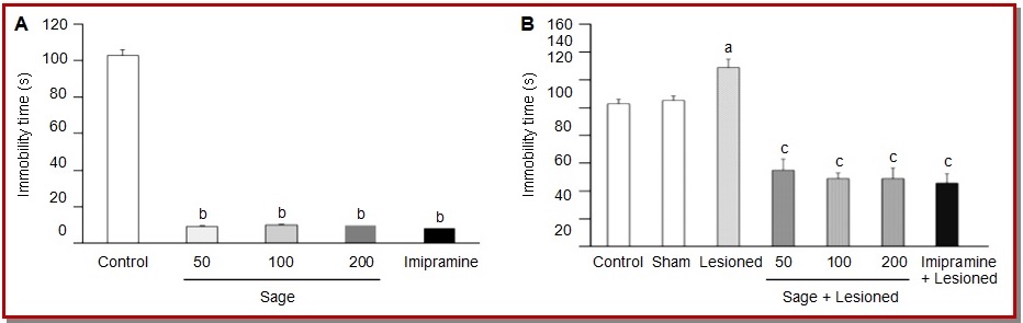 The anxiolytic and antidepressant like effects of Salvia officinalis extract (50, 100 and 200 mg/kg) were evaluated using marble burying, forced swimming and open-field tests in intact and hippocampal lesioned rats. Additionally, S. officinalis was evaluated on rat's memory using conditioned learning test. and we screened the methanolic extract for anti-oxidant activity, phytochemical and high performance liquid chromatography analyses. The administration of sage extract showed a significant reduction of immobility time in lesioned and intact animals during the forced swim test and anxiolytic effect in marble burying test. In the case of conditioned learning paradigm, memory enhancement was observed in sage treated group which indicates a cognition improvement. These activities seem to be related to the anti-oxidant capacity and the phytochemicals (phenolic, flavonoid, and tannin) detected into the extract of S. officinalis. The findings show that the methanolic extract of sage possess antidepressant-like effect, anxiolytic activity and also may contain bioactive compounds that stimulate learning in rat.