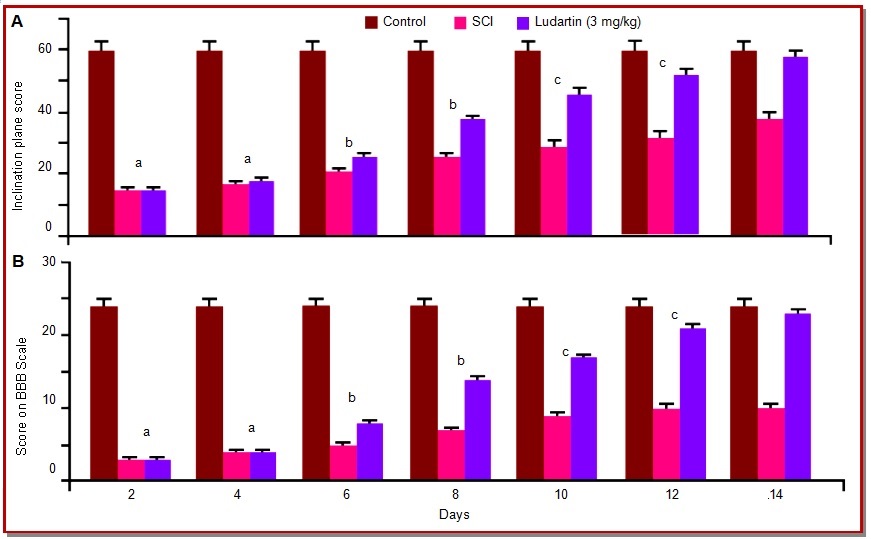 The present study investigates the effect of ludartin on spinal cord injury in rat model. Ludartin treatment decreased the expression of myeloperoxidase and malondialdehyde in spinal cord tissues. The expression of glutathione and superoxide dismutase were enhanced. It also exhibited inhibitory effect on reduction of NeuN-positive cells. The proportion of TUNEL positive cells was also regulated. In addition, ludartin treatment prevented the onset of apoptosis which was evident by decrease in caspase-3 and Bax level and increase of Bcl‑2 level. Up-regulation of tumor necrosis factor‑α, inter-leukin‑1β and I interleukin‑6 by spinal cord injury was suppressed by ludartin treatment. There was improvement in locomotion of rats by treatment with ludartin. Ludartin treatment of spinal cord injury rats improves locomotion by inhibiting inflammatory cytokine expression and preventing cell apoptosis. Thus, ludartin has therapeutic importance in spinal cord injury treatment.