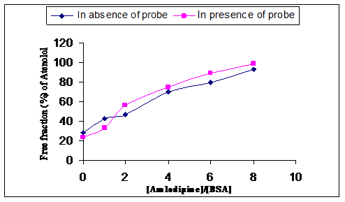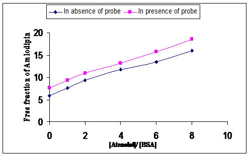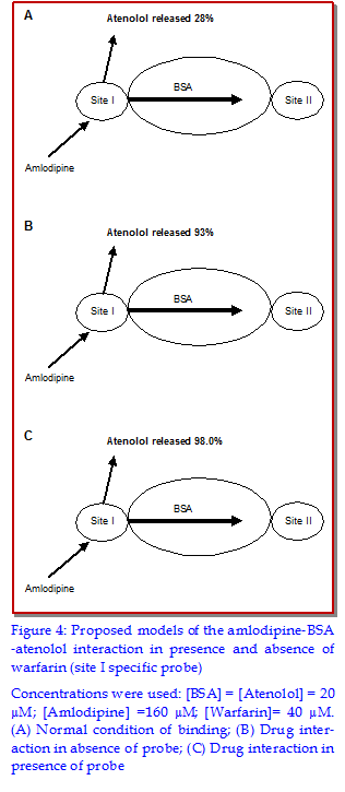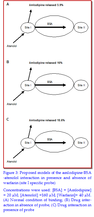 The binding of atenolol (selective ?1-blocker) and amlodipine (calcium channel blocker) to bovine serum albumin (BSA) was studied by equilibrium dialysis method in order to have an insight into the binding chemistry of these two to BSA. Free atenolol concentration was increased due to addition of amlodipine which reduced the binding of the compounds to BSA. However, the free fraction was increased to a level as it was expected from direct competitive displacement while the free atenolol concentration was increased according to increasing the amlodipine concentration when only the BSA was present. The result obtained when the binding site was blocked by sufficient amount of amlodipine was that the increment of free concentration of atenolol was prominent. When no amlodipine was added the free concentration of atenolol was only 28% whereas this release was 93 % to 98.01% when amlodipine was added with increasing concentration.