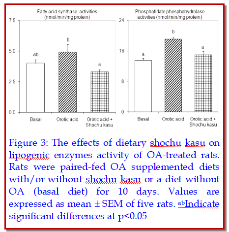 The effects of dietary shochu kasu (5%) on orotic acid-induced fatty liver were studied in rats. Liver triglyceride content of orotic acid-fed rats increased by 5-fold in comparison to basal group. Shochu kasu reduced triglyceride content by two-third. The activities of fatty acid synthase and phosphatidate phosphohydrolase significantly decreased that was approximately by 35% and 20%, respectively. The serum lipid levels however were nearly unchanged. The alleviation of fatty liver in rats with shochu kasu, therefore, was associated with the inhibition of fatty acid synthase and phosphatidate phosphohydrolase activities.