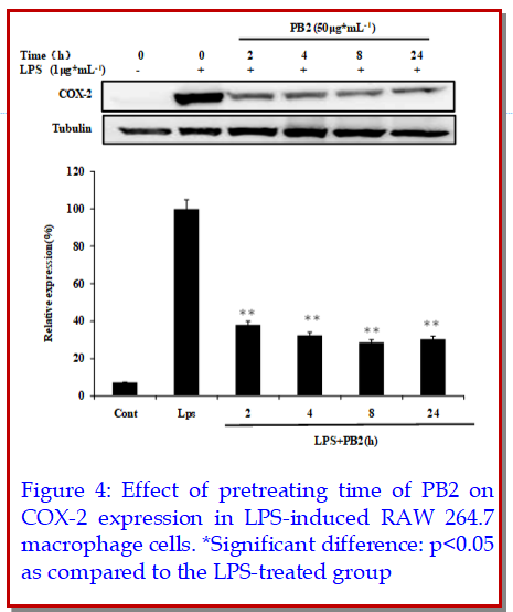 Dimeric procyanidin B2 (PB2) is one of phenolic compounds in apple pomace, an agro-industrial byproduct in apple juice processing. This work focused on purification of PB2 from apple pomace using sephadex column chromatography and its potential effect on lipopolysaccharide (LPS)-induced inflammation using RAW264.7 macrophages. PB2 with the purity of 72.28 ± 1.85% was successfully afforded using resin and gel column chromatographic technique. Anti-inflammatory tests suggested that the expression of cyclooxygenase-2 (COX-2) in LPS-induced murine RAW264.7 macrophages was suppressed in a PB2 concentration-dependent manner. PB2 at no less than 50 ?g·mL-1 could significantly suppress inflammation in the LPS-induced cells. Moreover, this suppressive effect was not correlated with PB2 pretreating. However, the COX-2 expression was not reduced in LPS pretreatment way followed by PB2 exposure, which suggested that PB2 has no repairing function. The results showed that high pure PB2 prepared from apple pomace has a remarkable anti-inflammatory property.
