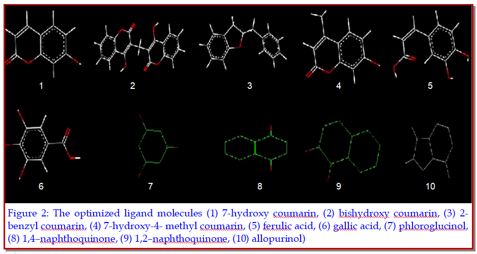 In an attempt to develop potent anti gout agents, coumarin derivatives and polyphenolic compounds were selected for present study. The docking energy of 2-benzyl coumarin was found to be -7.50 kcal/mol which was less than that of the standard allopurinol (-4.47 kcal/mol). All the selected compounds were found to exhibit lower binding energy (-7.50 to -4.68 kcal/mol) than allopurinol. Docking results confirm that selected compounds showed greater inhibition of xanthine oxidase due to their active binding sites. In xanthine oxidase assay, IC50 value of 2-benzyl coumarin was found to be 26 ± 1.16 µg/mL, whereas that of allopurinol was 24 ± 0.28 µg/mL. All the compounds exhibited IC50 values ranging between 26 ± 1.16 to 58 ± 0.74 µg/mL. In enzyme kinetic studies, coumarin derivatives showed competitive and polyphenolic compounds showed non competitive type of enzyme inhibition. It can be concluded that coumarin derivatives could be a remedy for the treatment of gout and related inflammatory disorders.
