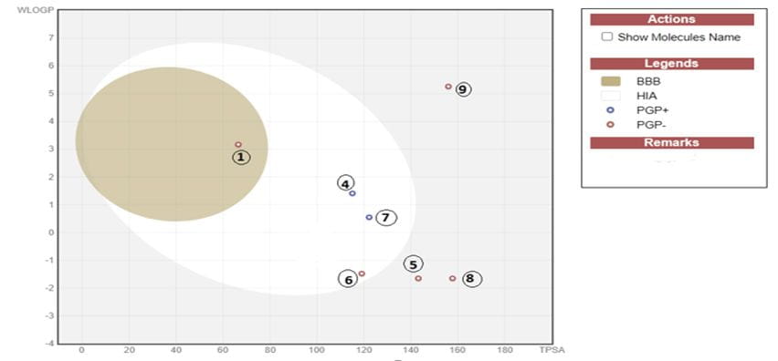 Figure 1 Boiled egg model for compounds (1) Tecovirimat, (2) Tipranavir, (3) Remdesivir, (4) Fluocinolone, (5) Molnupiravir, (6) Acyclovir, (7) Famciclovir, (8) Cidofovir, and (9) Brincidofovir showed blood brain barrier permeability (BBB), P-glycoprotein (P-gp), human intestinal absorption (HIA) of each drug. The yellow zone indicates BBB permeability; blue and red dots indicate P-gp substrate positivity and negativity, respectively.