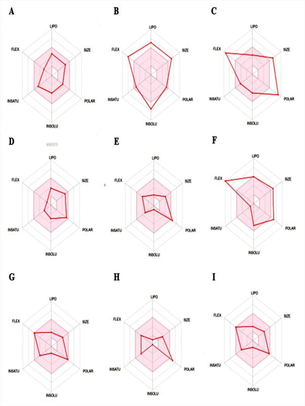 Figure 2 The bioavailability radars of (A) Tecovirimat, (B) Tipranavir, (C) Remdesivir, (D) Fluocinolone, (E) Molnupiravir, (F) Famciclovir, (G) Acyclovir, (H) Cidofovir, and (I) Brincidofovir retrieved from SwissADME. The bioavailability radar illustrates key physicochemical properties influencing oral drug-likeness, including solubility (INSOLU: −6 to 0; good gastrointestinal dissolution), SIZE (150–500 g/mol; suitable permeability and binding), lipophilicity (LIPO: −0.7 to 5.0; better permeability and hydrophobicity balance), flexibility (FLEX: 0–9 rotatable bonds; molecular flexibility for absorption), insaturation (INSATU: Csp³ fraction 0.25–1; structural stability), and polarity (POLAR: TPSA 20–130 Ų; suitable polarity for intestinal absorption). The light reddish region represents the optimal physicochemical space for oral bioavailability; compounds fitting within this area are predicted to possess favorable absorption and permeability profiles.