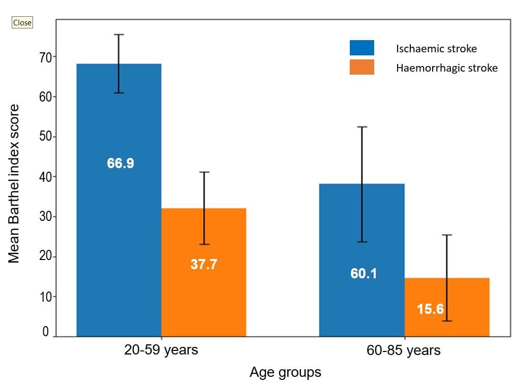 Mean Barthel Index (BI) scores were significantly higher in ischaemic stroke patients 62.0 (20.8) compared with haemorrhagic stroke patients 24.6 (21.3), indicating substantially greater functional independence in the ischaemic group (P < 0.001; 95% Confidence Interval for mean difference: 27.77–47.16). Age-stratified analysis demonstrated that older adults (60–85 years) had lower mean BI scores than younger adults (20–59 years) in both stroke subtypes. Across the age groups (20–59 and 60–85 years) patients with haemorrhagic stroke consistently exhibited markedly lower functional independence compared patients with ischaemic stroke, based on Barthel Index scores (Figure 1).