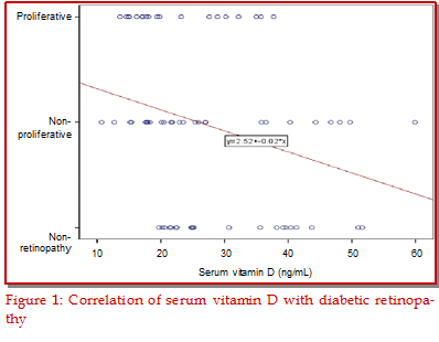 The present study was aimed to evaluate the association of serum 25-hydroxy vitamin D and parathormone in 46 patients of type 2 diabetes mellitus with diabetic retinopathy [non-proliferative, (n=27); proliferative (n=19)]. Twenty one diabetic patients without retinopathy were taken as control. Serum 25-hydroxy vitamin D and intact parathyroid hormone were measured by chemiluminescence microparticle immunoassay. Concentration of 25-hydroxy vitamin D differed significantly among groups (p=0.018) and it was significantly lower in proliferative diabetic retinopathy than no diabetic retinopathy (p=0.003). Logistic regression analysis revealed that vitamin D deficiency [25-hydroxy vitamin D <20 ng/mL] was indepen-dently associated with development of diabetic retinopathy (p=0.007, OR 20.90, 95%CI 2.33-187.23). In conclusion, vitamin D deficiency is associated with diabetic retinopathy complicating type 2 diabetes mellitus.