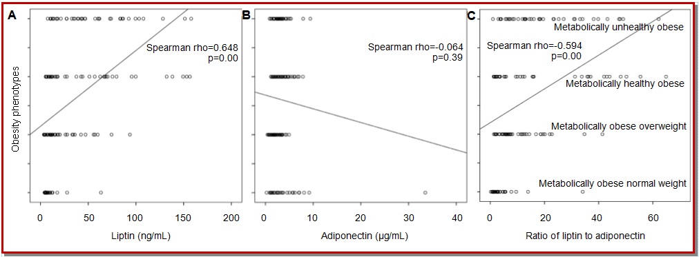 The present study was aimed to find out the frequency of obesity phenotypes and to correlate adipocyte dysfunction with different obesity phenotypes. A total of 1,507 apparently healthy adults attending the outpatient department were grouped into three based on body mass index which were then further categorized into six groups according to metabolically unhealthy or healthy phenotypes by the presence or absence of metabolic syndrome. Of them, metabolically obese normal weight, overweight, healthy obese and unhealthy obese groups were included as obesity phenotypes. Then by purposive sampling, leptin and adiponectin concentration of 184 subjects with different phenotypes were measured to find out the adipocyte dysfunction. Metabolically obese overweight followed by metabolically unhealthy obese were more prevalent i,e., 24.9% and 19.5%. All obesity phenotypes except metabolically obese normal weight were significantly documented with adipocyte dysfunction (p<0.05).