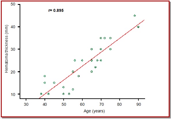 Patients with chronic subdural hematoma encounter certain difficulties in diagnosis, especially in elderly, due to the characteristically non-specific symptoms and signs. Early diagnosis and proper operative treatment, on the other hand, results in complete recovery in most of the cases. In this study, the clinical features and factors of 31 patients with chronic subdural hematoma, associated with the thickness of chronic subdural hematoma were analyzed. The mean age was 62 ± 13.9 years. The maximum hematoma thickness in the axial CT scan was 25 mm. The thickness of hematoma obtained from axial plain CT had a positive relationship with the patient’s age where r=0.895 and p<0.001 signifies that the thickness of hematoma increased with the increasing age. But the hematoma thickness was not related to co-morbidity such as diabetes mellitus, hypertension and ischemic heart disease. The presentation of the patient with higher hematoma thickness with hemiparesis was statistically significant and with lower thickness with headache and vomiting.