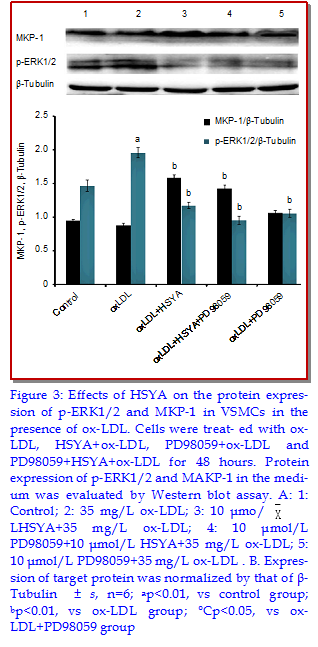 To investigate the relationship between the suppression of Hydroxysafflor yellow A (HSYA) on the oxidized low density lipoprotein (ox-LDL) induced proliferation of vascular smooth muscle cells (VSMCs) and the mRNA and protein expression of extracellular signal-regulated protein kinase 1/2 (ERK1/2) and mitogen activated protein kinase phospholipase-1 (MAKP-1), VSMCs were treated with HSYA at 10 ?mol/L and/or ox-LDL at 35 mg/L for 48 h. MTT assay was done to measure cell survival rate, flow cytometry to detect cell cycle, reverse transcription PCR and Western blot to detect the expression of ERK1/2 and MAKP-1. When compared to cells treated with ox-LDL alone, the survival rate of cells treated with two reagents was reduced and the proportion of cells in G0/G1 phase significantly increased, with increased MKP-1 expression. The study suggests HSYA can inhibit VSMC proliferation via increasing MKP-1 expression, reducing p-ERK1/2 activity and suppressing cell cycle.