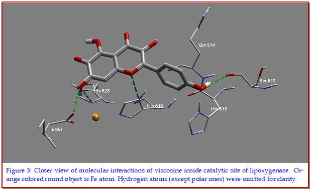 Viscosine was isolated from Dodonaea viscosa, which showed significant lipoxygenase inhibitory activity (IC50: value 39 ± 0.17). Molecular docking simulations were conducted to explore molecular binding mode, and to help elucidate molecular mechanism behind its significant inhibitory activity. Molecular interactions of viscosine with catalytic triad (His523, His518, Ile875) inside active site of lipoxygenase via hydrogen bonding, seems to be the major factor involved in its significant lipoxygenase inhibitory activity.