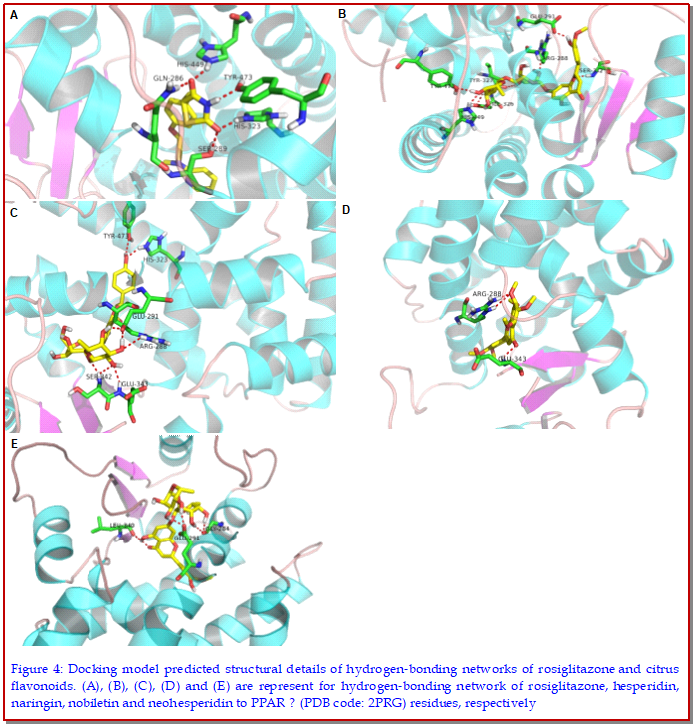 Citrus flavonoids isolated from citrus peel (flavedo and albedo) were taken as ligands for molecular docking. The molecular targets, (i.e. glucokinase, glycogen synthase kinases 3?, peroxisome proliferator-activated receptor gamma, and dipeptidyl peptidase IV) whose crystallographic structures are available on the PDB database as 1V4S, 1Q4L, 2PRG, 2ONC respectively, were used for the docking analysis using the Autodock tool V 4.2 and ADT v1.5.4 programs. The docking studies of the ligands citrus flavonoids with four different target proteins showed that citrus flavonoids are good molecules which dock well with various targets related to diabetes mellitus. The above results demonstrate that citrus flavonoids might be potentially used for blood glucose regulation.