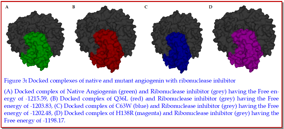 The most detrimental missense mutations of angiogenin causing Amyotrophic lateral sclerosis were identified computationally and the substrate binding efficiencies of these mutations were also analyzed. Out of 12 variants, I-Mutant 2.0, SIFT and PolyPhen programs identified 3 variants that were less stable, deleterious and damaging respectively. Modeling of these 3 variants was performed to understand the change in their conformations with respect to the native angiogenin by computing their RMSD and Total energy. The native and the 3 mutants were docked with ribonuclease inhibitor to explain the binding efficiencies of those detrimental missense mutations. The loss of binding affinity with their interacting protein namely ribonuclease inhibitor was investigated by computing the flexibility of binding amino acids of angiogenin and computing the binding free energy (ΔG) between native and mutant complexes.