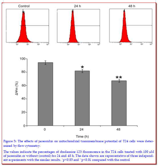 Jaceosidin, isolated from Artemesia argyi, has been shown to possess promising anticancer potential against various cancer cells. However, its effect against bladder cancer cells remained unknown. In this study, for the first time, we investigated the effects of jaceosidin on cell proliferation, cell cycle, and apoptosis in bladder cancer T24 cells by using MTT assay and flow cytometric analysis. The results revealed that jaceosidin decreased the cell viability of bladder cancer T24 cells in a dose- and time-dependent manner. Flow cytometric analysis demonstrated that jaceosidin significantly triggered apoptosis in T24 cells and arrested cell cycle at G2/M phase in a time-dependent manner. Further characterization showed that jaceosidin-induced apoptosis is associated with dissipation in mitochondrial membrane potential (??m), up-regulation of Bax and down-regulation of Bcl-2 in jaceosidin-treated T24 cells. These in vitro results suggested that jaceosidin should be further examined for in vivo activity and molecular mechanism in human bladder cancer.