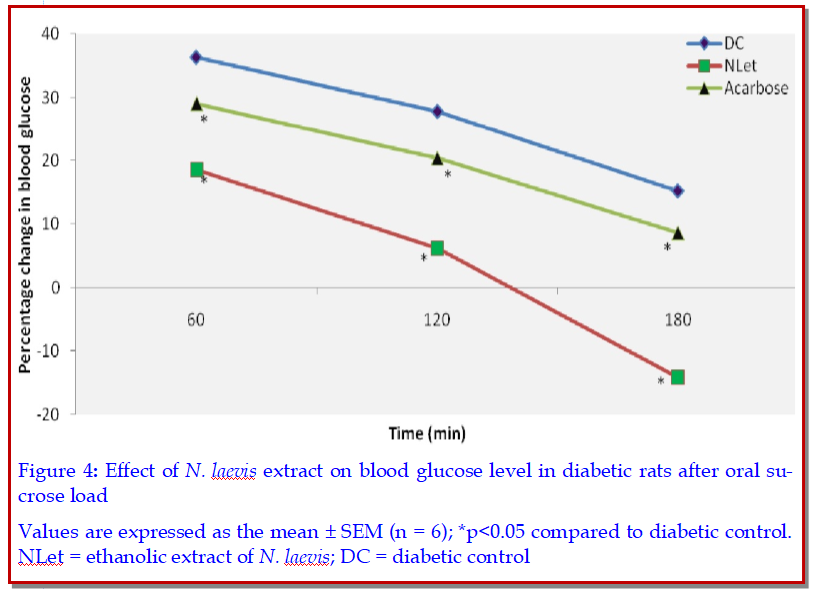 Owolabi OJ, Amaechina FC, Okoro M. Effect of ethanol leaf extract of Newbouldia laevis of blood glucose levels in diabetic rats. Tropical J Pharm Res. 2011; 10: 249-54.