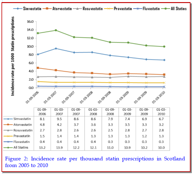 Statins are highly effective in managing hypercholesterolaemia in patients with or without chronic heart disease due to extensive evidence for safety, efficacy and cost effectiveness. Observational cross sectional retrospective cohort study was done in approximately 200 primary care practices in Scotland. Frequency, rates and time trends for statin prescriptions together with demographic data and the prescribing patterns for high dose simvastatin and newer statins in its place was measured. 63%, 27%, 5%, 4% and 1% patients were prescribed simvastatin, atorvastatin, pravastatin, rosuvastatin and fluvastatin respectively (n=1,91370). Prevalence for individual statin as well as for all statin prescriptions, significantly increased (p<0.05). Except rosuvastatin the incidence of other statins prescription significantly decreased (p<0.05). The highest number of patients, 884 (24%) switched to atorvastatin from high dose simvastatin. Increase in prevalent use and decrease in incident use of statins, implies the diminished cardiovascular disease related mortality and subsequent increased life expectancy of patients with cardiovascular disease.