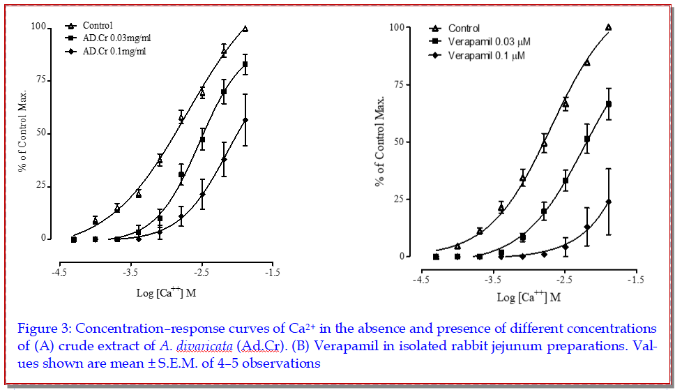 Traditional healers in Pakistan use the herb Amberboa divaricata as tonic, aperiant, deobstruent, febrifuge, antidiarrheal, antiperiodic, antipyretic, anti-cough and in skin disorders. In vitro tissue experiments were carried out on rabbit jejunum to elucidate the possible mechanism of its prescribed effects on gastrointestinal tract, while antibacterial and antioxidant experiments were performed to provide pharmacological evidence of its traditional use in skin disorders. The 70%methanolic crude extract of A. divaricata produced dose dependent relaxation in isolated rabbit jejunum tissue in a concentration range of 0.13.0 mg/mL (n=5). Calcium response curves were constructed at concentration of 0.03 and 0.1 mg/mL (n=5), which produced rightward shift in a pattern similar to that of verapamil, confirming the calcium channel blocking activity. Agar disc diffusion assay at a concentration of 10 mg crude extract/disc showed clear zones of inhibition.