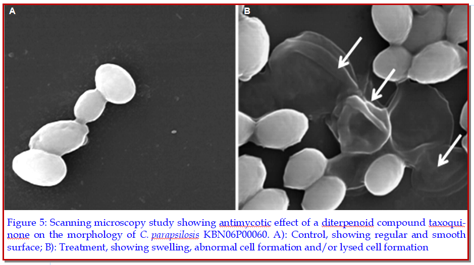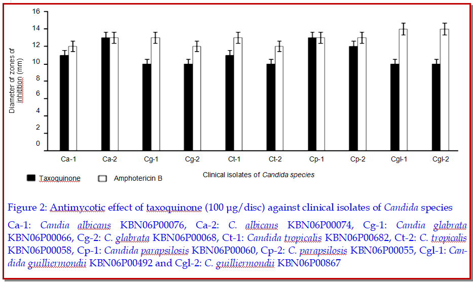 The objective of this study was to confirm the antimycotic potential of a diterpenoid compound taxoquinone, isolated from Metasequoia glyptostroboides against pathogenic isolates of Candida species. The taxoquinone (100 mcg/disc) displayed potential anticandidal effect against Candia albicans KBN06P00076, KBN06P00074, C. glabrata KBN06P00066, KBN06P00068, C. tropicalis KBN06P00682, KBN06P00058, C. parapsilosis KBN06P00060, KBN06P00055, and C. guilliermondii KBN06P00492 and KBN06P00867 as a diameter of zones of inhibition, found in the range of 10 ± 0.6 to 13 ± 1.1 mm. The minimum inhibitory and minimum fungicidal concentrations of taxoquinone against the tested clinical isolates were found in the range of 125 to 500 and 125 to 1,000 mcg/mL, respectively. On the viable counts of the tested fungal isolates, the taxoquinone evoked a remarkable anticandidal effect. Elaborative study of SEM revealed potential detrimental effect of taxoquinone on the morphology of C. parapsilosis KBN06P00060 at MIC concentration. These findings confirmed therapeutic potential of taxoquinone.