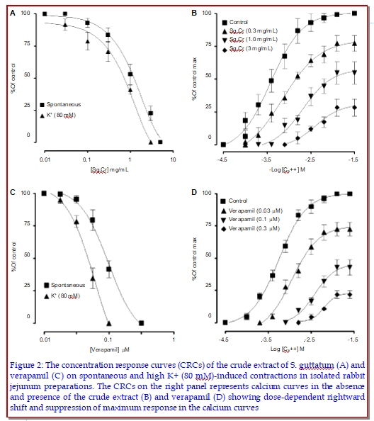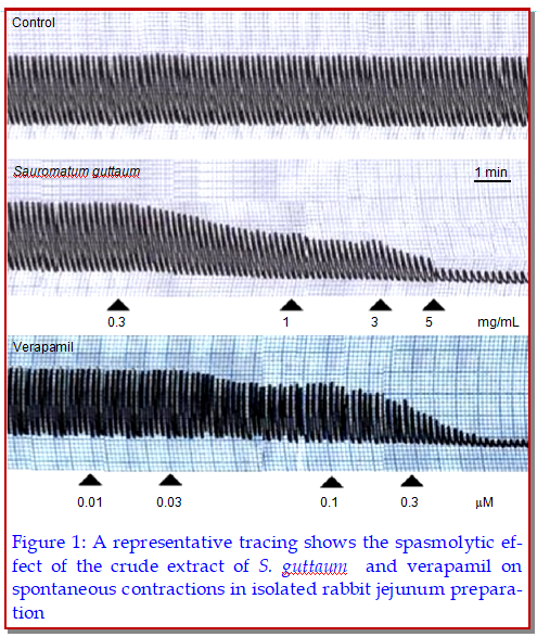The aim of the present work was to study the functional nature of the potential spasmolytic effect of the crude extract of Sauromatum guttaum. It was found positive for the presence of alkaloid and tannins. In isolated rabbit jejunum preparation, S. guttaum caused inhibition of spontaneous and high K+ (80 mM)-induced contractions, with respective EC50 values (95% confidence intervals) of 1.50 mg/mL (0.69-3.02) and 1.17 mg/mL (0.81-1.61), similar to verapamil. Inhibition of high K+ -induced contractions suggests Ca++ antagonistic effect. The Ca++channel blocker activity of S. guttaum was confirmed when pre-treatment of the tissues with extract (0.3-3 mg/mL) caused a rightward displacement in the Ca++ concentration-response curves. Moreover, in the acute toxicity test, S. guttaum was found safe up to the dose of 3 g/kg. The findings of the current study suggest that the S. guttaum exhibited spasmolytic activity, possibly mediated through inhibitory effect on Ca++ entry and was found safe and this current study provides first evidence to the potential use of this plant as antispasmodic and can play a possible role as antidiarrheal.