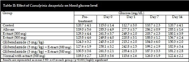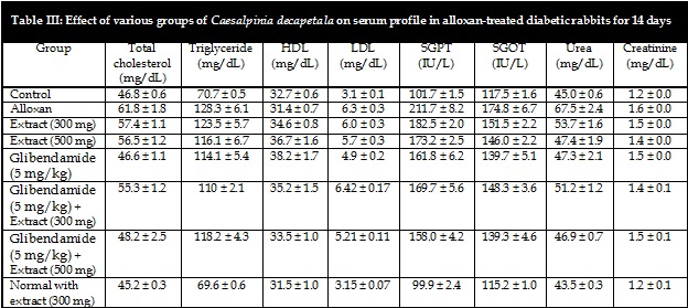 The anti-hyperglycemic, anti-hyperlipidemic, kidney and hepatoprotective potential of Caesalpinia decapetala were evaluated in alloxan-induced diabetic rabbits. The plant extract showed concentration dependant significant (p<0.001) therapeutic potential in diabetic rabbits revealing improvement in lipid profile and liver and kidney functions. 300 mg/kg and 500 mg/kg oral extract were able to reduce average blood glucose levels from 250.6 mg/dL to 204.2 mg/dL and 188.2 mg/dL respectively during 14 days period, in comparison to 183.8 mg/dL of glibenclamide. There was no significant synergistic effect found, upon co-administration of both drug and extract representing the competitive binding to sulphonyl urea (SUR1), revealing possible mechanism of action for compounds in extract. Extract was found to be nephroprotective, hepatoprotective and improved lipid profile of alloxan-treated rabbits.