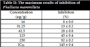Extracts of ten selected ascidians with a reputation of usefulness in treating diabetes were examined for alpha-amylase inhibition using an in vitro model. The extract with the highest activity was selected for further characterization. From the results ethyl acetate showed predominant amylase inhibition activity for all species and the maximum level of inhibition was recorded in Phallusia mammillata (68%) at 300 µg/mL and the lowest activity was noted in Microcosmus squamiger (12%) at 200 µg/mL. After preliminary results, the methanolic extract of P. mammallita were further assayed for confirmation of enzyme inhibition and the maximum results (82%) were obtained at 250 µg/mL and the IC50 value of P. mammillata were evidenced at 145.0 ± 0.4 µg/g. In the present study, P. mammillata indicated the maximum ?-amylase activity without toxic effects. Similarly, ?-glucosidase and ?-amylase inhibitor bromophenol, C6H5BrO was produced by P. mammillata.