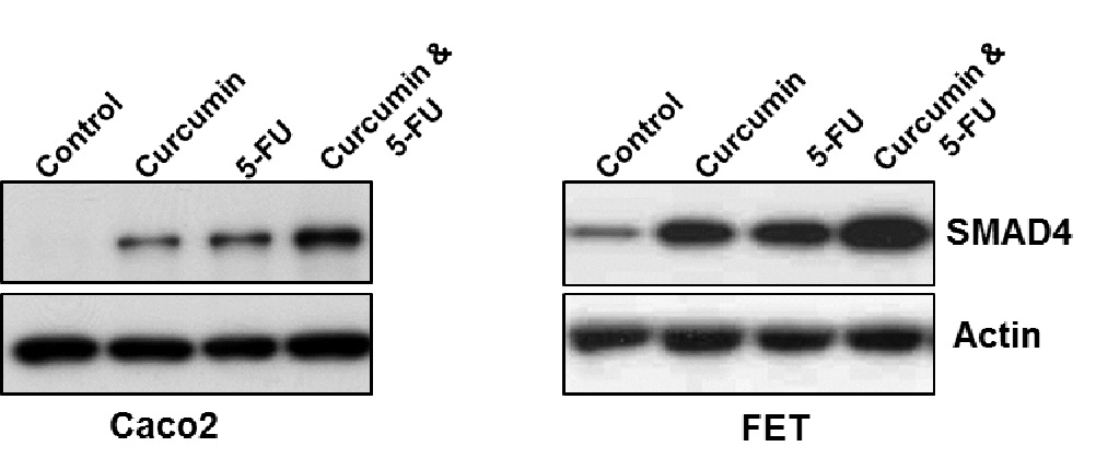 Aberrations in SMAD signaling have been widely associated with colon cancer progression. However, their significance in modulating drug response remains unknown. In this study we investigated the response of chemotherapeutic drugs in colon cancer cells that are with (SW620 and SW480) and without aberrations (FET-1 and Caco2) in SMAD signaling. These results showed that curcumin, 5-fluorouracil and their combinations induced less cell death in SMAD signaling non-responsive cells, while the apoptosis was (>2 fold) higher in SMAD responsive cells. Furthermore, these results showed that the apoptosis in SMAD non-responsive cells was reversed and increased (~2-fold) upon ectopic expression of SMAD-4. Finally, correlation with patients undergoing chemotherapy for colon cancer showed a strong association between SMAD aberration and tumor relapse in chemotherapy. Overall, the present data showed that SMAD signaling modulates the drug responses and their signaling status should be considered while designing chemotherapy regimen for colon cancer patients.