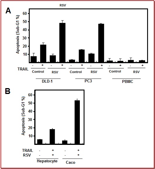 Resveratrol is a stilbenoid compound, and a promising potent chemopreventive bioactive agent. Here, we showed for the first time that the combined treatment with resveratrol and TRAIL drastically induced apoptosis in human colon cancer cells when compared to single treatments. Further, resveratrol markedly up-regulated TRAIL receptors, DR5 and DR4 and the results revealed that DR5 siRNA efficiently blocked apoptosis induced by the co-treatment with resveratrol and TRAIL, indicating that DR5 up-regulation by resveratrol helps to enhance TRAIL actions. In addition, the combined effect was tested on normal human cells. All the obtained results suggested that resveratrol is very useful for TRAIL-based treatments for cancer.