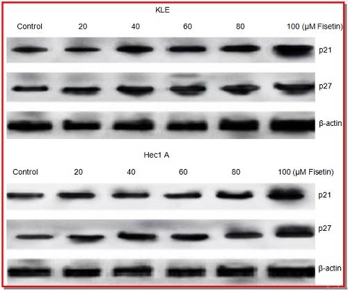 Endometrial cancer is one of the most prevalent gynaecological malignancies where, currently available therapeutic options remain limited. Recently phytochemicals are exploited for their efficiency in cancer therapy. The present study investigates the anti-proliferative effect of fisetin, a flavonoid on human endometrial cancer cells (KLE and Hec1 A). Fisetin (20-100 µM) effectively reduced the viability of Hec1 A and KLE cells and potentially altered the cell population at G2/M stage. Expression levels of the cell cycle proteins (cyclin B1, p-Cdc2, p-Cdc25C, p-Chk1, Chk2, p-ATM, cyclin B1, H2AX, p21 and p27) were analyzed. Fisetin suppressed cyclin B1 expression and caused inactiva-tion of Cdc25C and Cdc2 by increasing their phosphorylation levels and further activated ATM, Chk1 and Chk2. Increased levels of p21 and p27 were observed as well. These results suggest that fisetin induced G2/M cell cycle arrest via inactivating Cdc25c and Cdc2 through activation of ATM, Chk1 and Chk2.