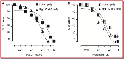 Abies pindrow is widely used in traditional practice for the treatment of diarrhea and bronchitis and the present study was designed to validate its folkloric uses. The crude extract of A. pindrow inhibit spontaneously contracting (1-10 mg/mL) and high K+ (80 mM)-induced pre-contracted rabbit jejunum (3 mg/mL) in concentration dependent manner. A rightward shift in Ca+2 concentration response curves was seen in the presence of crude extract (0.1-0.3), similar to verapamil. In isolated tracheal tissue, A. pindrow inhibited, high K+ and carbachol (1 µM)-induced contractions, at 3 mg/mL and 10 mg/mL respectively, similar to that caused by verapamil. These results indicate the presence of calcium channels blocked activity in crude extract of A. pindrow, which provide sound basis for medicinal uses of A. pindrow in diarrhea and bronchitis.