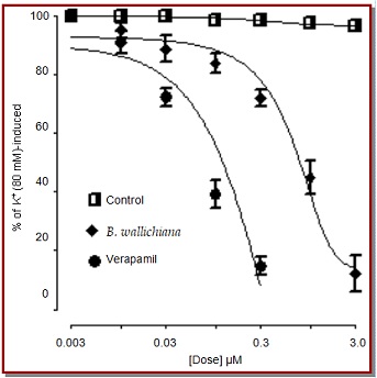 In vitro study was carried out to explore the pharmacological basis of crude extract of Buxus wallichiana for its folkloric uses in gastrointestinal, respiratory and vascular disorders. In jejunum preparations, crude extract (0.03 ± 1.0 mg/mL) caused a transient spasmogenic effect followed by the spasmolytic effect at higher doses (3.010 mg/mL). In atropinized jejunum preparation, crude extract inhibited the spontaneous and K+ (80 mM)-induced contraction, suggesting that spasmolytic effect is mediated through the Ca+2-channel blockade. The Ca+2-channel blockade effect was confirmed when pretreatment of tissue with extract produced a dose-dependent shift in Ca+2 concentration-response curves to the right, similarly as verapamil. Furthermore, crude extract exhibited non-specific relaxant effect on carbachol- (1 µM) and K+ (80 mM)-induced tracheal contractions, suggesting the coexistence of anticholinergic and Ca+2-antagonistic properties. Moreover, it relaxed the K+ (80 mM)- and phenylephrine (1 µM)-induced contraction in rabbit aorta, suggesting the Ca+2-channel blockade. These findings may validate the folkloric uses of B. wallichiana in constipation, bronchitis, asthma and hypertension.