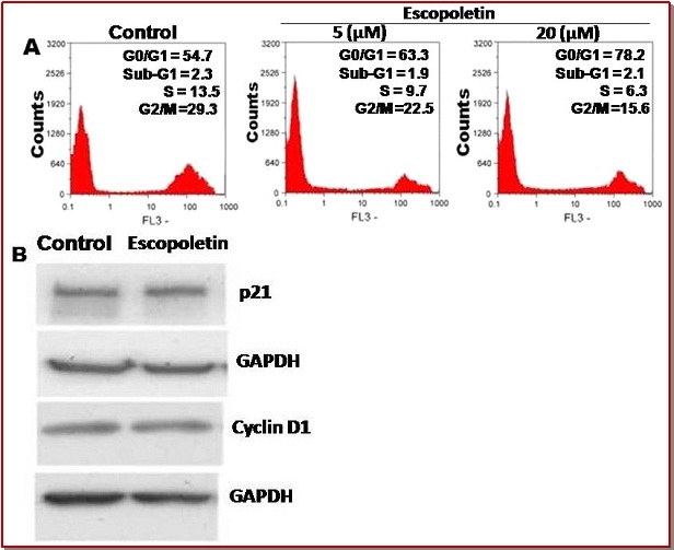 Escopoletin, a phenolic compound belonging to anthocyanin family shows promising antioxidant activities. In the present study, anti-cancer effects of escopoletin treatment in DU145 cells were investigated. The sulphorhodamine-B staining and annexin V and propidium iodide were respectively used for the analysis of cell viability and death. The results revealed a significantly higher cytotoxicity by escopoletin that caused cell death in DU145 cells. Escopoletin treatment in DU145 cells markedly inhibited cell growth through non-apoptotic cell death and induced significant reactive oxygen species (ROS) production. It also induced G1 cell cycle arrest and cyclin D1 accumulation through the enhanced expression of p21. However, the effect of escopoletin on DU145 cells was reversed by pretreatment with glutathione antioxidant. This suggests that escopoletin induced generation of ROS is responsible for the increased cytotoxicity in DU145 cells. Thus, escopoletin exhibits potential therapeutic efficacy for the treatment of prostate cancer.