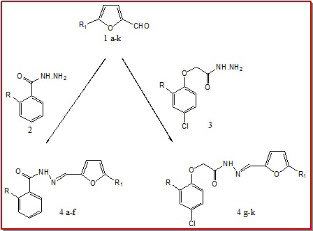 A new series of N-({5-(substituted aryl)-furan-2-yl}-methylidene)-hydrazides were synthesized with a new class of Schiff bases derived from the reaction of substituted phenyl-1-ketohydrazide 2 or 2-(4-chloro-3-methylaryloxy) acetohydrazide 3 with different 5-(substituted aryl)-2-furfuraldehyde (1a-k) to yield substituted N-({5-(substituted aryl)-furan-2-yl}-methylidene)-hydrazides-Schiff bases (4a-f, 4g-k). The title compounds were subjected to in vitro antibacterial screening against Gram positive bacterial strains- S. aureus, B. cereus, E. faecalis and S. epidermidis, and Gram negative bacteria strains- E. coli, S. typhi, S. dysenteriae and K. pneumoniae. The synthesized Schiff bases were also evaluated for their anthelmintic activity against two species of earthworms (Pheritima posthuma and Perionyx excavates). Some compounds have shown promising antibacterial and anthelmintic activities.