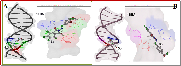 A new series of N-substituted phthalimide derivatives were prepared by condensation of appropriate amount of n-amino tetrachlorophthalimide with respective aldehyde in glacial acetic acid. The structural investigation of the synthesized compounds was done by spectroscopic methods (UV-Vis., IR, 1H and 13C NMR) and elemental analysis. The antibacterial screening of these compounds was performed against Escherichia coli and Staphylococcus mutans. The synthesized compounds were evaluated for their antioxidant potential using 2,2-diphenyl-1-picrylhydrazyl (DPPH) as a scavenging agent. The interaction ability of most promising compounds (3a and 3b) with native calf thymus DNA (Ct-DNA) was also studied by means of UV-Vis., circular dichroism (CD), viscosity measurements and thermal studies. The intrinsic binding constants (Kb) of 3a and 3b with Ct-DNA obtained from UV-Vis. absorption studies were 8 × 104 and 1 × 105, respectively. Molecular docking of target compounds (3a and 3b) against DNA dodecamer d(CGCGAATTCGCG)2 has been carried out. The test compounds exhibited remarkable antibacterial, antioxidant and DNA binding activities.