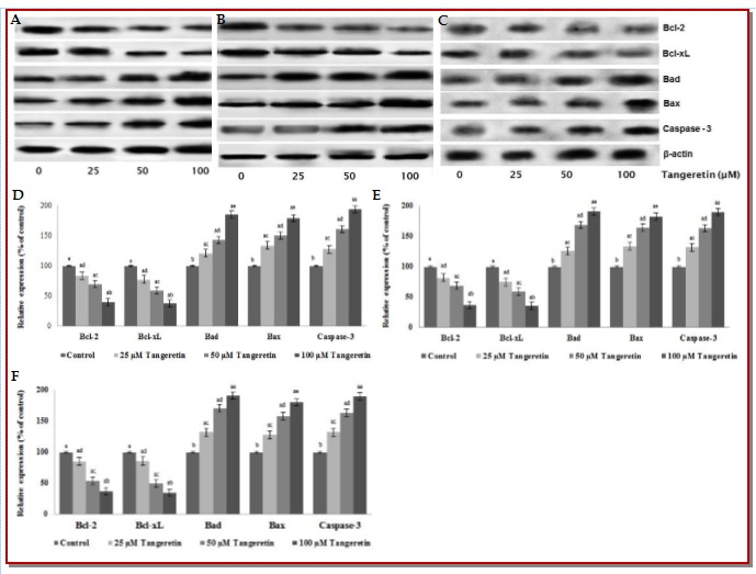 Despite advances in conventional therapies, treatment of prostate cancer is still a challenge. The study aims to assess the possible anti-cancer effects of tangeretin, a dietary flavonoid on human prostate cancer cells (DU145, PC3, LNCaP). Tangeretin (25, 50 and 100 µM) significantly inhibited cancer cell viability and induced DNA fragmentation and apoptosis by increasing caspase-3 and pro-apoptotic proteins (Bad and Bax) with reduced anti-apoptotic proteins (Bcl-2 and Bcl-xL) expressions. Significant inhibition of androgen receptor (AR) and prostate specific antigen (PSA) were seen. Dose-dependent inhibition in Notch signal was observed in expression of Notch 1 and Jagged 1 along with PI3/Akt/mTOR signalling pathway. The results suggest that tangeretin inhibited prostate cancer cell proliferation and induced apoptosis via inhibiting critical pathways in cancer development - AR signalling and PI3/Akt/mTOR - Notch signalling pathways.