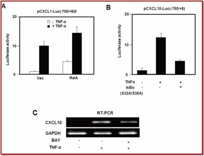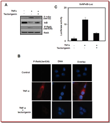 Effective immunomodulator and pro-inflammatory cytokine, Tumor necrosis factor-α (TNF-α) are considered to be responsible for connecting autoimmune pathological process and contagious diseases. TNF-α stimulates the C-X-C motif chemokine 10 (CXCL10) expression that is participated in migration of tumor, metastasis, and invasion. Tectorigenin, an o-methylated isoflavone, is present as a major portion in the Iris tectorum rhizomes. In this study, we investigated the tectorigenin effects as an anticancer drug. The obtained results showed that tectorigenin hinders the invasion of human colon cancer cells (Caco-2). We used reverse transcription PCR, q-PCR and enzyme linked immunosorbent assays to test whether the tectorigenin is involved in the inhibition of TNF-α induced CXCL-10 expression in the Caco-2 cell lines. Further, we tested TNF-α induced NF-κB activity using the tectorigenin. Collective results showed that tectorigenin inhibits the CXCL10 production by using TNF-α via NF-κB inhibition.