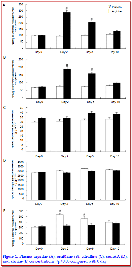 We expounded the effect of intravenous arginine on the healing of human skin graft donor sites. This randomized study was double blind and controlled by placebos from October 2012 to May 2015. Nine patients were selected into the arginine group and 10 were selected into the control group. There was no significance in age, weight, BMI, CRP, albumin and total plasma protein in arginine and control groups. Angiogenesis, re-epithelialization and neutrophil influx of wound healing were measured. The concentrations of plasma amino acid were measured to evaluate our intervention. In our study, plasma arginine and ornithine concentrations in arginine group were the highest after arginine-treated at 2 days. Supplementation of intravenous arginine could not affect on healing of human skin graft donor sites, improve angiogenesis, reepithelialization or neutrophil influx in rats.