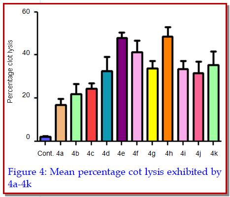 In the present study, a series of 1,3,4-oxadiazole derivatives (4a-4k) derived from benzimidazole were docked onto factor Xa (PDB: 1NFY) protein using SYBYLX 2.1. and also evaluated for in vitro clot lysis for thrombolytic activity. The synthesized molecules were also screened for in silico ADME studies. The molecular docking studies highlighted that the molecules showed high affinity towards 1NFY with higher docking score and the in silico ADME results were promising and indicated that the molecules holds great potential as a drug candidate. The thrombolytic evaluation was performed for decrease in solid clot weight by the clot lysis study at a concentration of 6.25, 12.5 and 25 µM strengths, respectively. The results of in vitro clot lysis for thrombolytic evaluation revealed that the tested compounds 4a-4k exhibited significant clot lysis with respect to negative control phosphate buffered saline and in comparison to the reference drug streptokinase (30,000 IU). Among all the tested compounds, compound 4j, 4d and 4g exhibited potent thrombolytic activity with EC50 value of 16.2, 18.1 and 23.7 µM, respectively. The thrombolytic efficacy investigation highlights that the synthesized compound 4j could be considered for further clinical studies to ascertain its possible hit as thrombolytic agents.